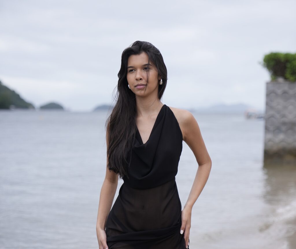 Vestido sofisticado e fluido, ideal para eventos à noite em destinos paradisíacos.